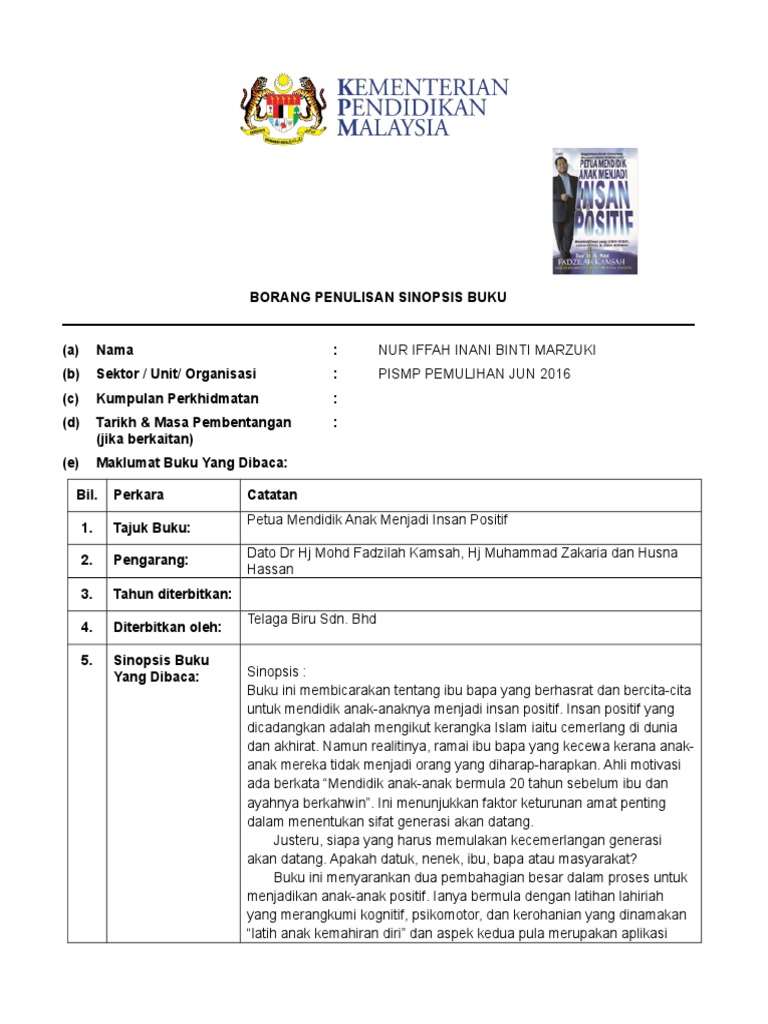 Borang Penulisan Sinopsis Buku Kpm - Sinopsis Buku Petua Mendidik Anak Menjadi Insan Positif - Borang sinopsis buku nama sekolah :