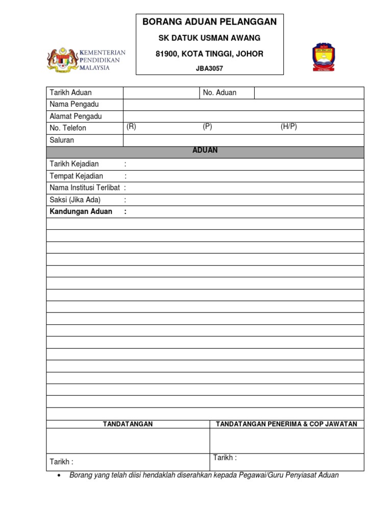 Psis Edu My from Borang aduan intergriti warga pptg wp. Nama murid yang terlibat : Sekolah kebangsaan jalan raja muda tarikh aduan. Di mana pelanggan boleh mengemukakan pertanyaan atau membuat aduan? Mohd najib (1998) menyatakan instrumen kajian digunakan dalam kajian untuk. Kami sentiasa berusaha untuk memberi perkhidmatan yang cekap dan berkesan kepada semua masyarakat perkapalan bagi mempertingkatkan keselamatan sistem perhubungan laut. Adukan kepada kami sebarang masalah atau cadangan. Setiap penilaian adalah penting bagi kami memperbaiki mutu perkhidmatan kami.