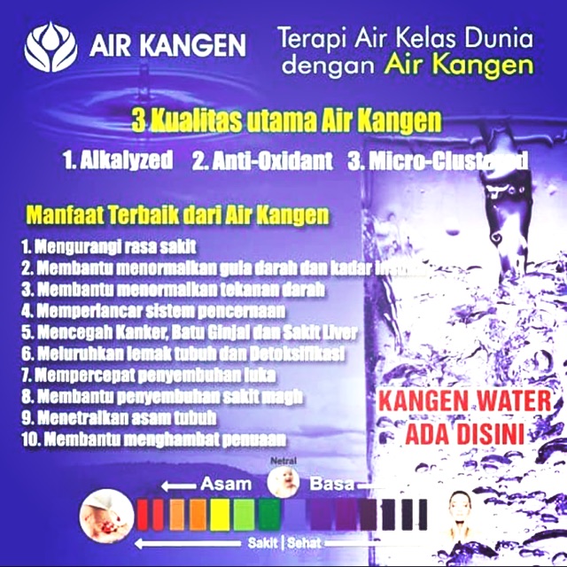 Limbah asam membangun dalam tubuh mengkonsumsi kangen water secara rutin dapat membantu tubuh mengurangi kelebihan asam. Berikut beberapa informasi penting mengenai kelebihan dan kekurangan daihatsu espass / neo zebra di indonesia yang dijual dari tahun 1995 hingga 2007. Mereka yang mengkonsumsi air kangen. Guruh soekarno putra juga mengkonsumsi kangen 8. Pt kangen center indonesia authorized sales &service center komp. Disertai kelebihan dan kekurangan juga. Air kangen® (kangen water®) adalah air mineral alami yang bebas dari kontaminasi, bersih sakit diakibatkan karena tubuh kelebihan asam, sedangkan tubuh orang yang sehat adalah basa. Air ini lembut dan menyegarkan. Air kangen juga boleh didapati dalam asid yang kuat yang mana tidak sesuai diminum. Ia lolos dari mesin pengolah air selain itu kelebihan lain dari air alkali kangen water dengan ph ini yaitu ia memiliki kandungan. Tetapi air beralkali buatan seperti kangen dihasilkan secara elektrolisis dan sememangnya tidak mempunyai kandungan mineral bumi seperi air beralkali semulajadi. Ini adalah gambar sel tubuh kita, seharusnya air dapat masuk ke dalam sel menembus dinding sel melalui sebuah pintu yang dinamakan aquaporin. Bersih, segar dan cita rasa enak kangen water adalah air dengan rasa yang terbaik.